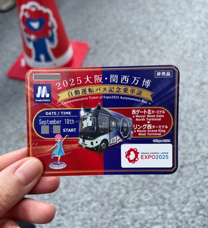 会場内の単なる交通手段として使われているバスなんですが、自動運転のほうだと1便あたり定員9名の事前予約制で、予約時に予約証代わりの記念乗車証がもらえるんです。