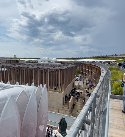 上に上ることは上って、リング内側にある海外パビリオンの建物を眺めながらゆっくりと歩き出したんですが、雨が降り始めまして…。