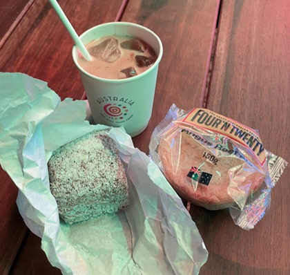 破いた紙袋に入っているのがラミントン(650円)で、オーストラリアの伝統スイーツだそうです。ついでにオージーミート・パイ(850円)と、アイスカフェラテ(650円)も注文しました。