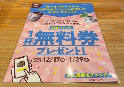 モバイルオーダーでドリンクを1杯注文するとスタンプが1個もらえ、スタンプを6個集めるとドリンク1杯無料券がもらえるそうです。