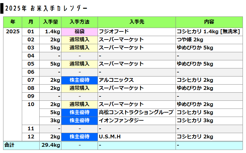 2025年に入手したお米は合計29.4kg。(前年は27kg)