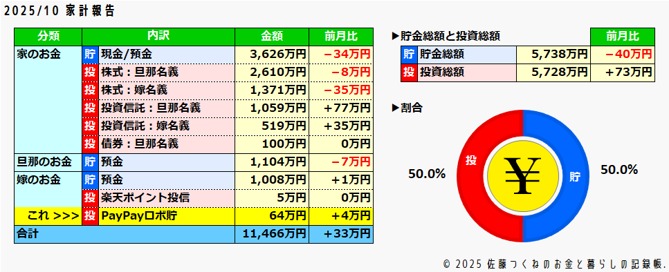 なお、毎月の資産報告でいうと、このPayPayつみたてロボ貯蓄は「嫁のお金」に該当します。