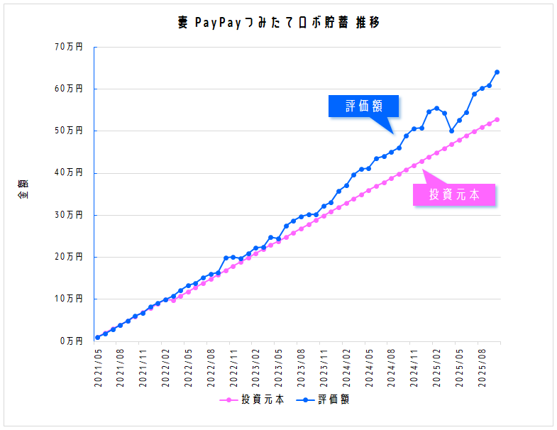 これまでの評価額と投資元本の推移を、ざっくりグラフにするとこんな感じです。(2021/05~2025/10)